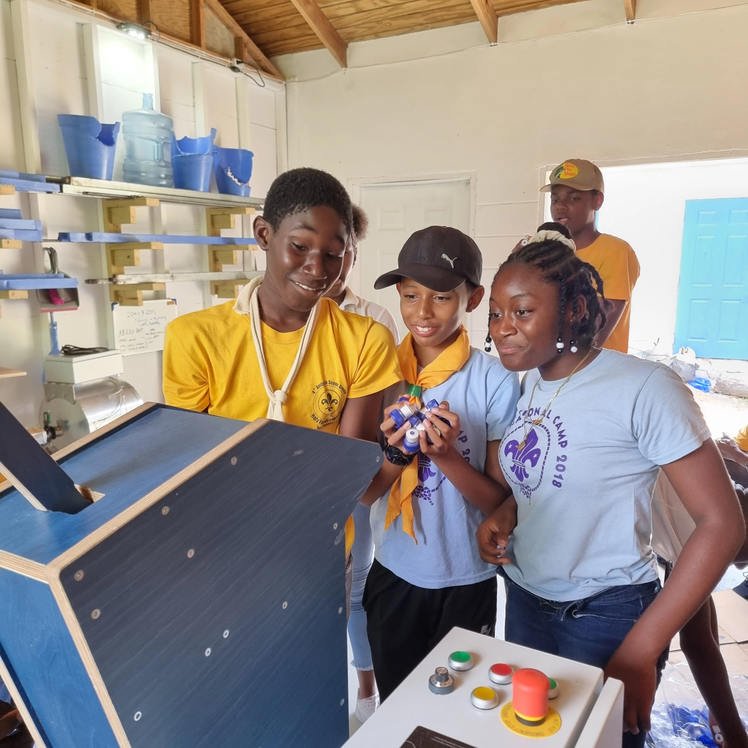 Students putting buttlecaps into the grinder machine at the WISH Workshop