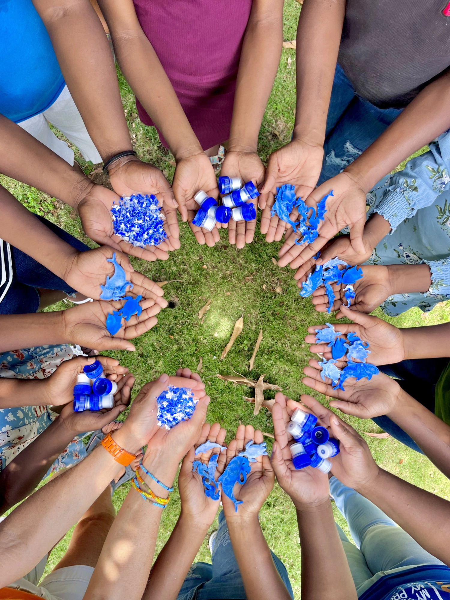 Participants from Adopacoastline holding bottlecaps and the sea creatures they made in their hands