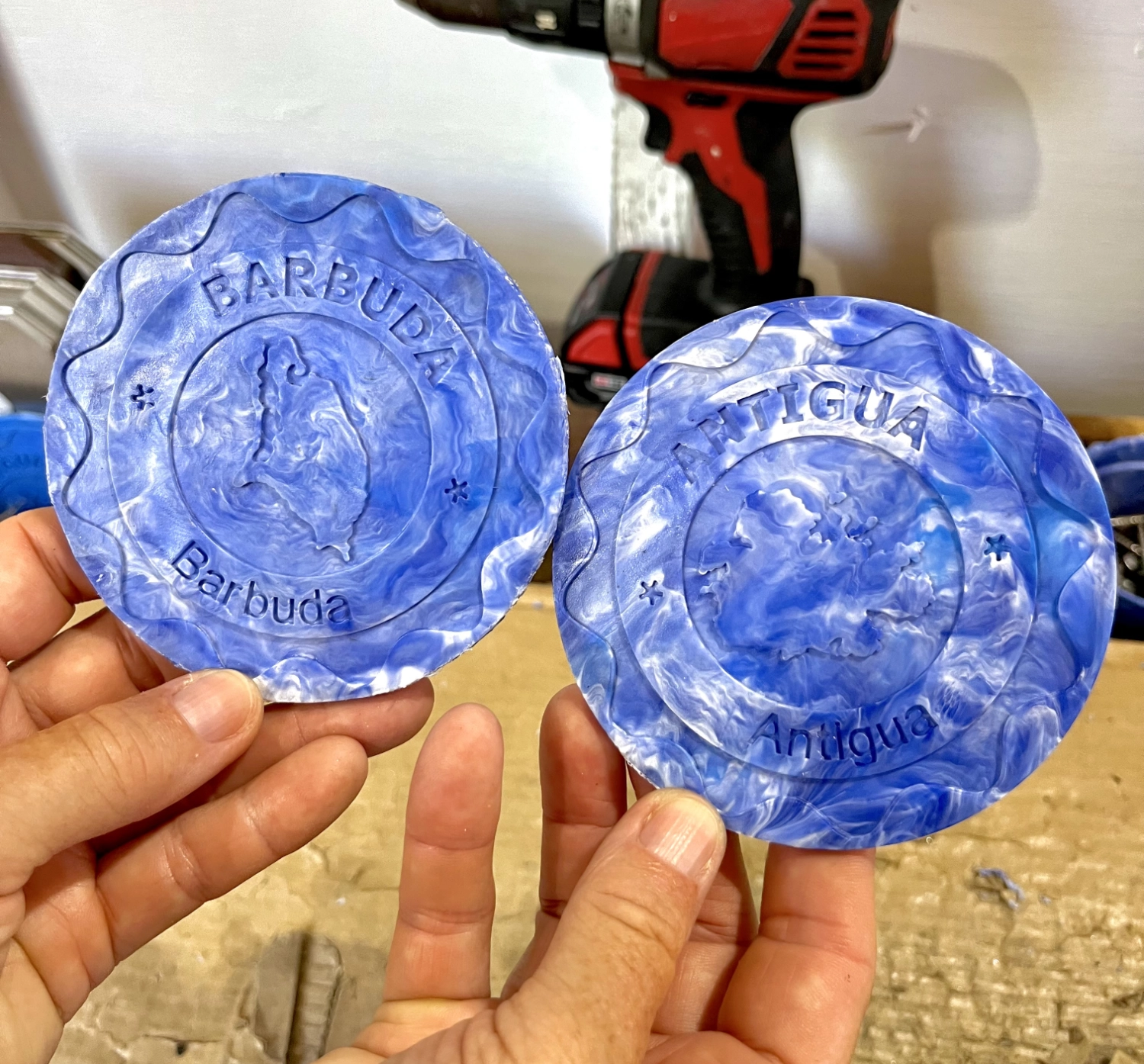 Coasters made from bottlecaps imprinted with the islands Antigua and Barbuda